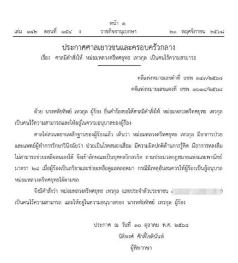 ราชกิจจาฯประกาศ หม่อมหลวงตรีทศยุทธ เทวกุล เป็นคนไร้ความสามารถ 24 พ.ย. 2568 เวลา 18:09 น.