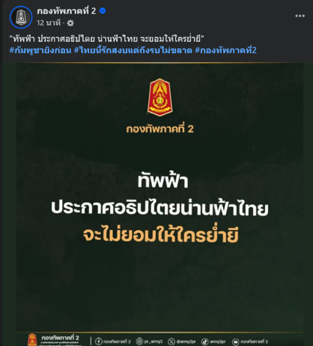 วันที่ 9 ธันวาคม 2568 มีรายงานว่า กองทัพภาค 2 ได้โพสต์จ้อความระบุว่า “ทัพฟ้า ประกาศอธิปไตย น่านฟ้าไทย จะยอมให้ใครย่ำยี”