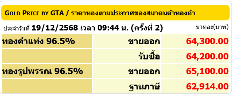 สำหรับราคาทองคำเปิดตลาดประจำวันที่ 19 ธันวาคม 2568 เปิดตลาดปรับลง 50 บาท ในครั้งที่1 ต่อมามีการปรับลงอีก 50 บาท ในครั้งที่2 โดยทองรูปพรรณขายออกบาทละ 65,100 ตามข้อมูลจากเว็บไซต์ของ สมาคมค้าทองคำ เมื่อเวลา 09.44 น.