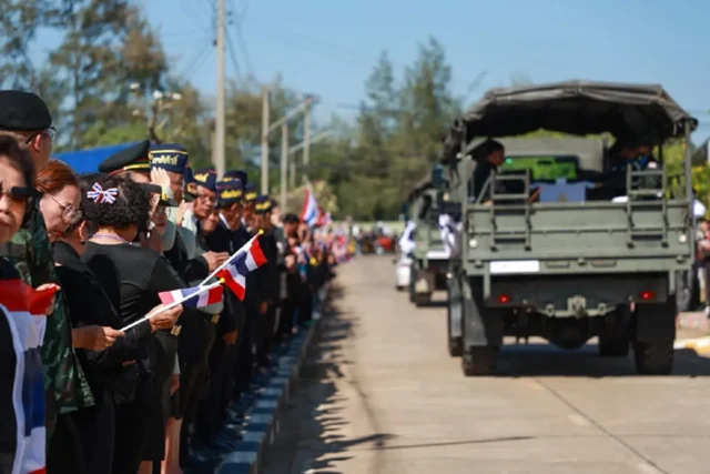 ชาวบ้านที่มาร่วมส่งต่างโบกธงไตรรงค์พร้อมน้ำตา และกล่าวขอบคุณทหารกล้าทั้งสองที่เสียสละชีวิตเพื่อปกป้องอธิปไตยของชาติ