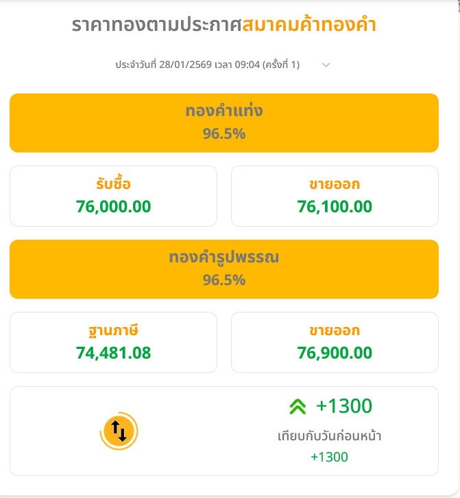 ราคาทองวันนี้ 28 มกราคม 2569 โดย สมาคมค้าทองคำ ประกาศราคาทองครั้งที่ 1 (เปิดตลาด) เมื่อเวลา 09.04 น. ปรับตัวขึ้นแรง 1,300 บาท พุ่งเลยระดับ 75,000 บาท เหนือระดับ 76,000 บาท สูงสุดเป็นประวัติการณ์ครั้งใหม่บริเวณ 76,100 บาท หลังจากเมื่อวาน(อังคาร) ราคาทองคงที่ไม่เปลี่ยนแปลงจากวันจันทร์บริเวณ 74,800 บาท