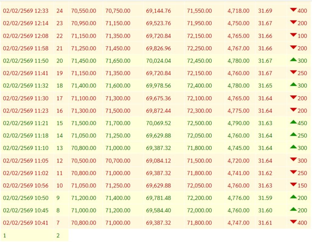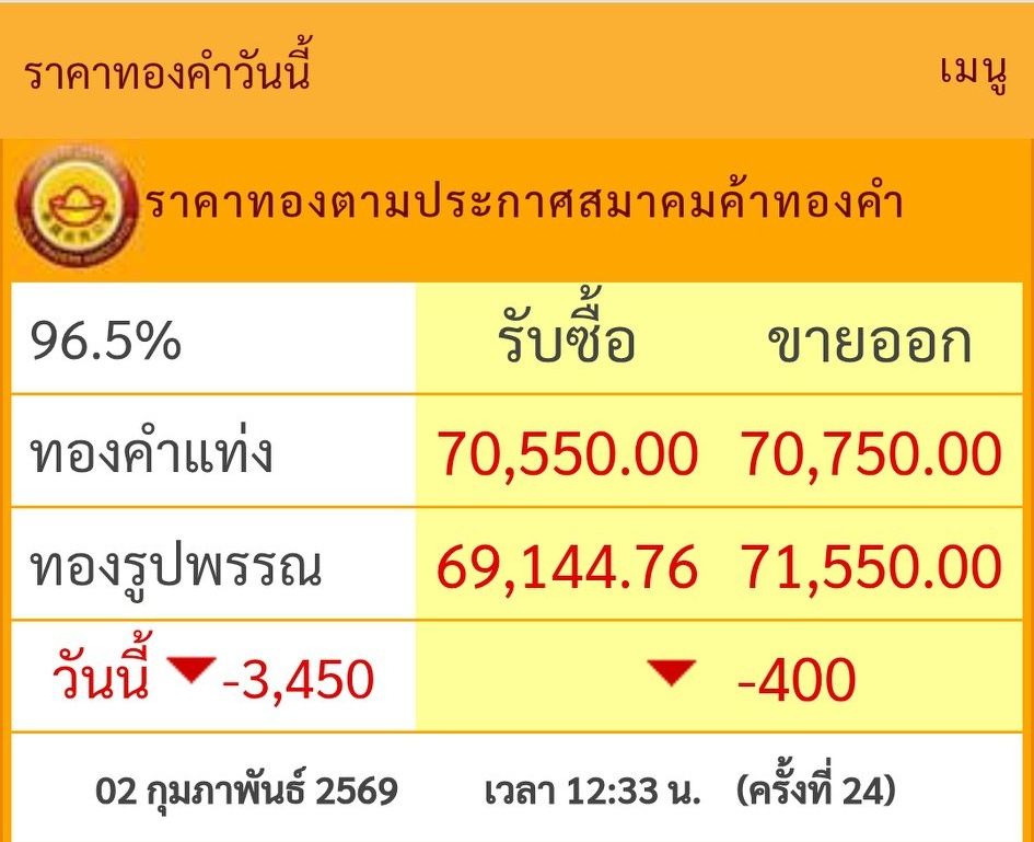 วันที่ 2 กุมภาพันธ์ 2569 สมาคมค้าทองคำ รายงานว่าราคาทองไทยวันนี้ ครั้งที่ 1 เมื่อเวลา 09:45 น. พบว่า ราคาปรับลด 1,650 บาท ส่งผลให้ ราคาทองคำแท่ง รับซื้อบาทละ 72,350.00 บาท ขายออกบาทละ 72,550.00 บาท