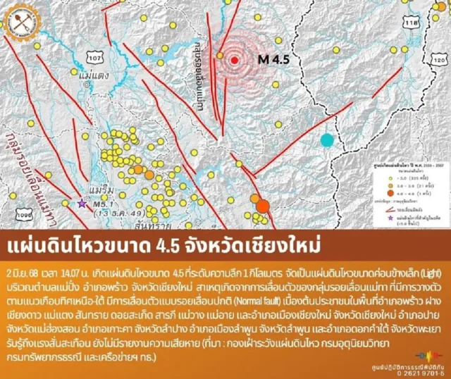 กรมทรัพยากรธรณี แจ้งว่า วันนี้ (2 มิ.ย.68) เวลา 14.07 น. เกิดแผ่นดินไหวขนาด 4.5 ที่ระดับความลึก 1 กิโลเมตร จัดเป็นแผ่นดินไหวขนาดค่อนข้างเล็ก (Light) บริเวณตำบลแม่ปั๋ง อำเภอพร้าว จังหวัดเชียงใหม่ สาเหตุเกิดจากการเลื่อนตัวของกลุ่มรอยเลื่อนแม่ทา ที่มีการวางตัวตามแนวเกือบทิศเหนือ-ใต้ มีการเลื่อนตัวแบบรอยเลื่อนปกติ (Normal fault)
