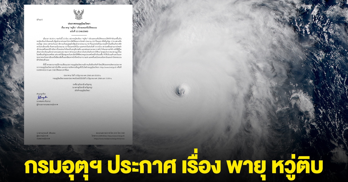 กรมอุตุนิยมวิทยา ประกาศ เรื่อง พายุ หวู่ติบ บริเวณทะเลจีนใต้ตอนบน ฉบับที่ 12 (146/2568)