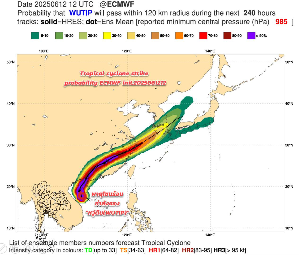 วันที่ 13 มิ.ย. 68 กรมอุตุนิยมวิทยา ประกาศเรื่องพายุ “หวู่ติบ” บริเวณทะเลจีนใต้ตอนบน ฉบับที่ 12 (146/2568) ระบุว่า เมื่อเวลา 04.00 น. ของวันนี้ (13 มิ.ย.) พายุโซนร้อน “หวู่ติบ” บริเวณทะเลจีนใต้ตอนบนได้ทวีกำลังแรงขึ้นเป็นพายุโซนร้อนกำลังแรงแล้ว