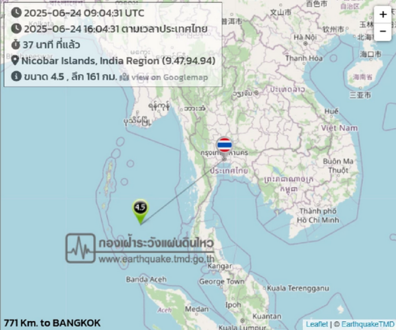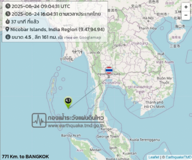 2025-06-24 16:04:19 | แรงสั่นสะเทือนขนาด 4.4 แมกนิจูด ศูนย์กลางที่หมู่เกาะนิโคบาร์ ประเทศอินเดีย ทางทิศตะวันตกเฉียงเหนือของ อ.เมือง จ.พังงา ประมาณ 490 กม.