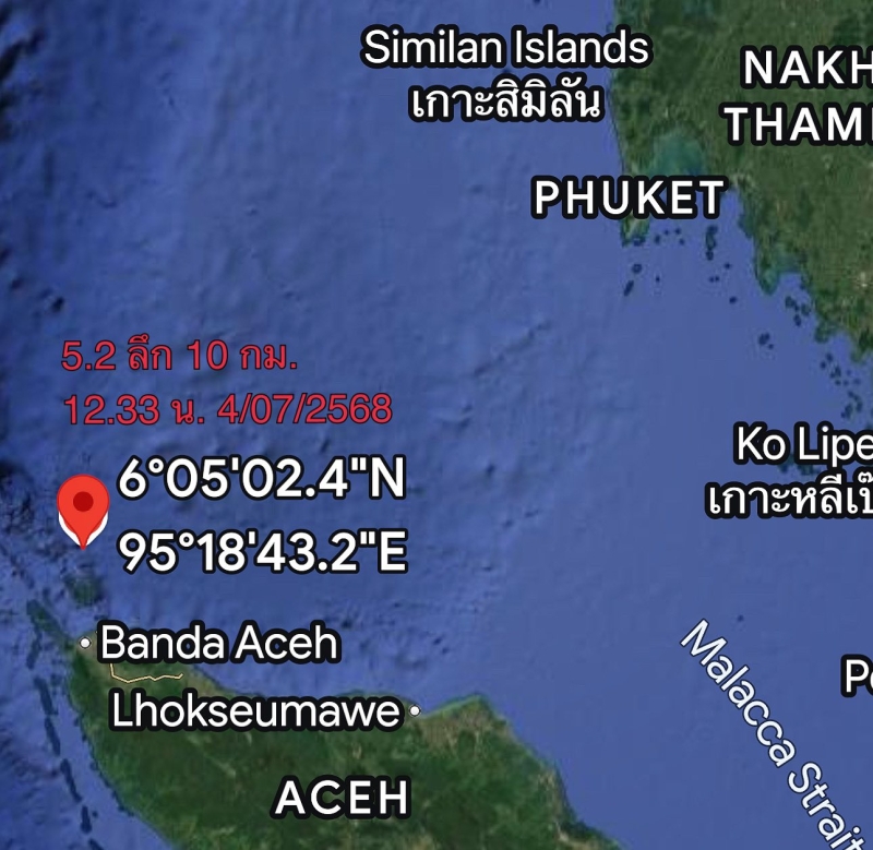 เมื่อวันที่ 4 กรกฑาคม 2568 ที่ผ่านมา เพจเฟซบุ๊ก Thon Thamrongnawasawat หรือ ผศ.ดร.ธรณ์ ธำรงนาวาสวัสดิ์ นักวิทยาศาสตร์ทางทะเลจากมหาวิทยาลัยเกษตรศาสตร์ ได้โพสต์เตือน เหตุแผ่นดินไหวระบุว่า ล่าสุดตอนเที่ยงครึ่ง แผ่นดินไหวเลื่อนลงมาทางใต้ ตรงจุดบอบบางที่เคยเกิดสึนามิ 2547 ขนาด 5.2 ลึก 10 กม. (ไม่มีสึนามิ) ช่วงนี้มองๆ กันไว้บ้าง หากเกิดก็คงคล้ายกับคราวก่อน แต่หวังว่าจะไม่นะฮะ ข้อมูล กองเฝ้าระวังแผ่นดินไหว