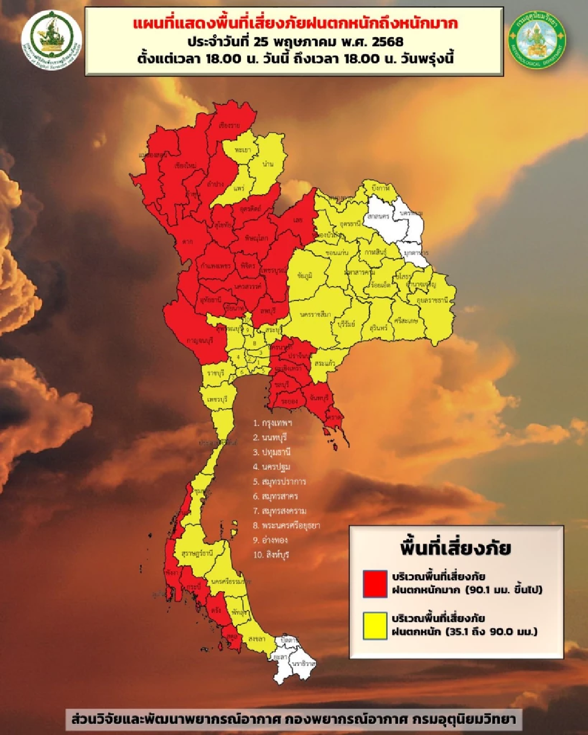 25 พ.ค. 2568 กรมอุตุนิยมวิทยา ออกประกาศฉบับที่ 10 (130/2568) เรื่อง ฝนตกหนักถึงหนักมากบริเวณประเทศไทย (มีผลกระทบจนถึงวันที่ 27 พ.ค. 2568)