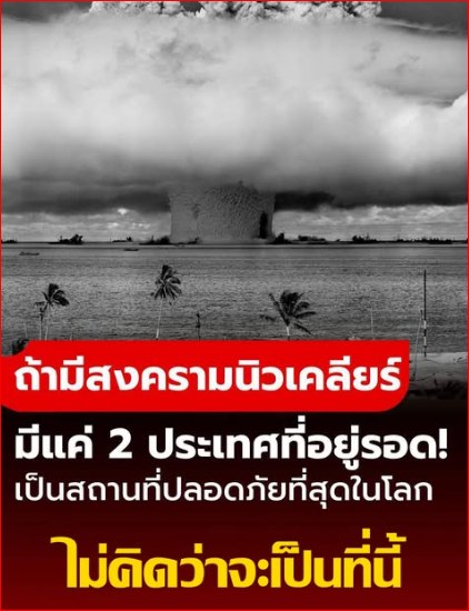 แชร์เรื่องนี้ ผู้เชี่ยวชาญด้านสงครามนิวเคลียร์ เผย หากเกิดสงครามโลกครั้งที่ 3 และมีการใช้อาวุธนิวเคลียร์ มีเพียง 2 ประเทศเท่านั้นที่มีโอกาสรอดชีวิต และเป็นสถานที่ปลอดภัยที่สุดในโลกหลังการระเบิดของระเบิดปรมาณู