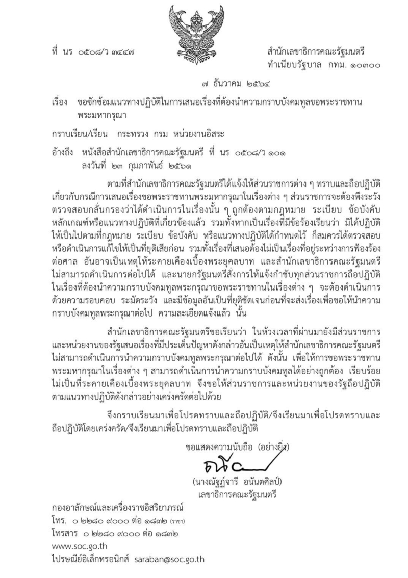 สำนักเลขาธิการคณะรัฐมนตรีขอเรียนว่า ในห้วงเวลาที่ผ่านมายังมีส่วนราชการและหน่วยงานของรัฐเสนอเรื่องที่มีประเด็นปัญหาดังกล่าวอันเป็นเหตุให้สำนักเลขาธิการคณะรัฐมนตรีไม่สามารถดำเนินการนำความกราบบังคมทูลพระกรุณาต่อไปได้ ดังนั้น เพื่อให้การขอพระราชทานพระมหากรุณาในเรื่องต่างๆ สามารถดำเนินการนำความกราบบังคมทูลได้อย่างถูกต้อง เรียบร้อย ไม่เป็นที่ระคายเคืองเบื้องพระยุคลบาท จึงขอให้ส่วนราชการและหน่วยงานของรัฐถือปฏิบัติตามแนวทางปฏิบัติดังกล่าวอย่างเคร่งครัดต่อไปด้วย