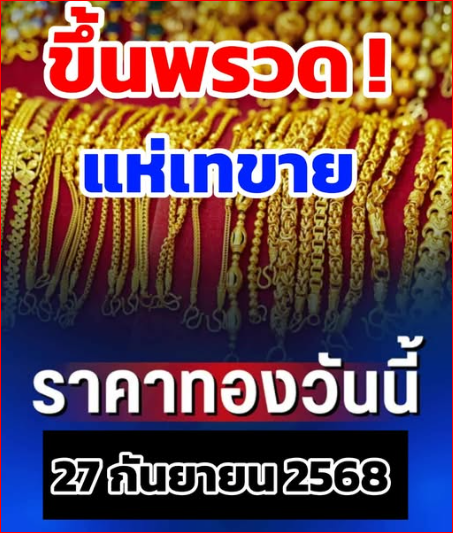 ราคาทองคําวันนี้ประจำวันเสาร์ที่ 27 กันยายน 2568 ประกาศครั้งเดียว เมื่อเวลา 09.06 น. ปรับตัวขึ้นพรวดเดียว 200 บาท สู่บริเวณ 57,400 บาท