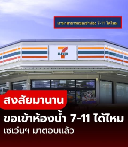 ล่าสุด มีคนเข้ามากระทู้ลงเว็บไซต์ Pantip.com ตั้งคำถามว่า “เราสามารถขอเข้าห้องน้ำ 7-11 ได้ไหม” พร้อมเล่าว่า ตนเองขับรถมาไกลมาก หากแวะซื้อของในเซเว่นฯ ก่อนไปถึงที่ทำงาน ถ้าอยากจะขอเข้าห้องน้ำในเซเว่นฯ ได้ไหม จึงมาตั้งกระทู้สอบถามเพื่อความแน่ใจ