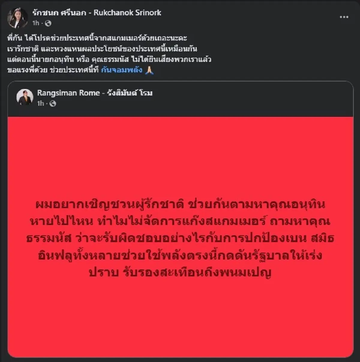 “ไอซ์ รักชนก” สส.พรรคประชาชน ตัดสินใจโพสต์ข้อความ ฝากข้อความถึง “กัน จอมพลัง” ขอแรงช่วยชาติจากปัญหาสแกมเมอร์