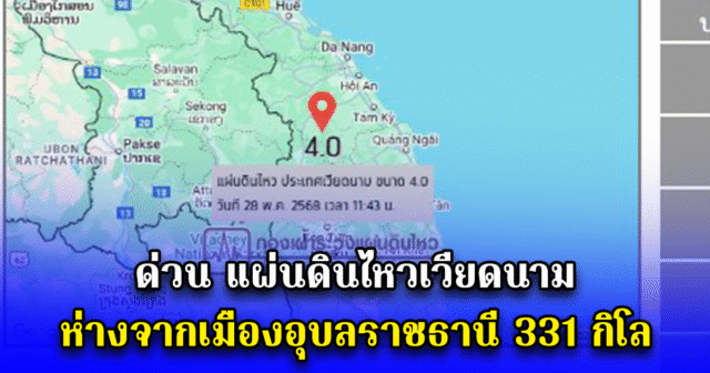 เวียดนาม: เวลา 18:43:17 น. เกิดแผ่นดินไหวขนาด 4.0 จุดศูนย์กลางที่เวียดนาม (พิกัด 15.298°N, 107.936°E) ความลึก 10 กม. ห่างจาก อ.เมือง จ.อุบลราชธานี ไปทางตะวันออกเฉียงเหนือประมาณ 331 กม.