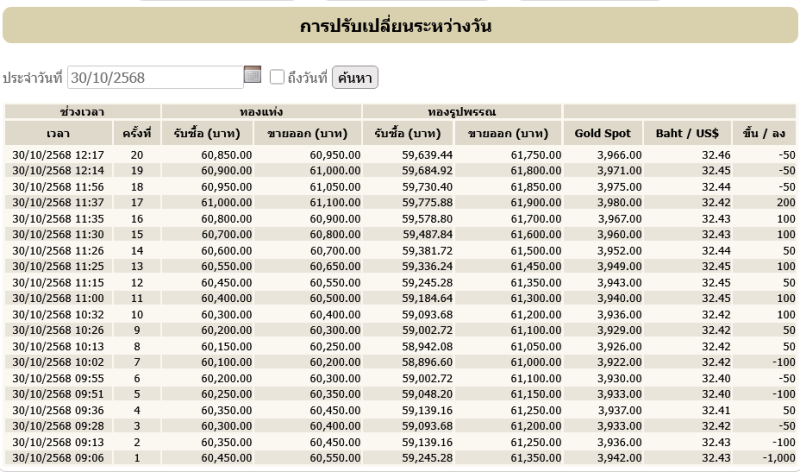 ราคาทองคำ วันที่ 30 ตุลาคม 2568