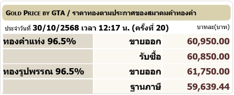 สำหรับราคาทองคำเปิดตลาดประจำวันที่ 30 ตุลาคม 2568 เปิดตลาดปรับลง 1,000 บาท ในครั้งที่1 ต่อมามีการปรับขึ้น-ลงรวมแล้ว 20 ครั้ง โดยทองรูปพรรณขายออกบาทละ 61,750 ตามข้อมูลจากเว็บไซต์ของ สมาคมค้าทองคำ เมื่อเวลา 12.17 น.